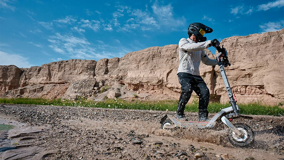 The NAVEE XT5 Pro uses 12-inch off-road tubeless pneumatic tires and a front–rear Damping Arm™ patented suspension system to absorb shocks and smooth out uneven terrain.