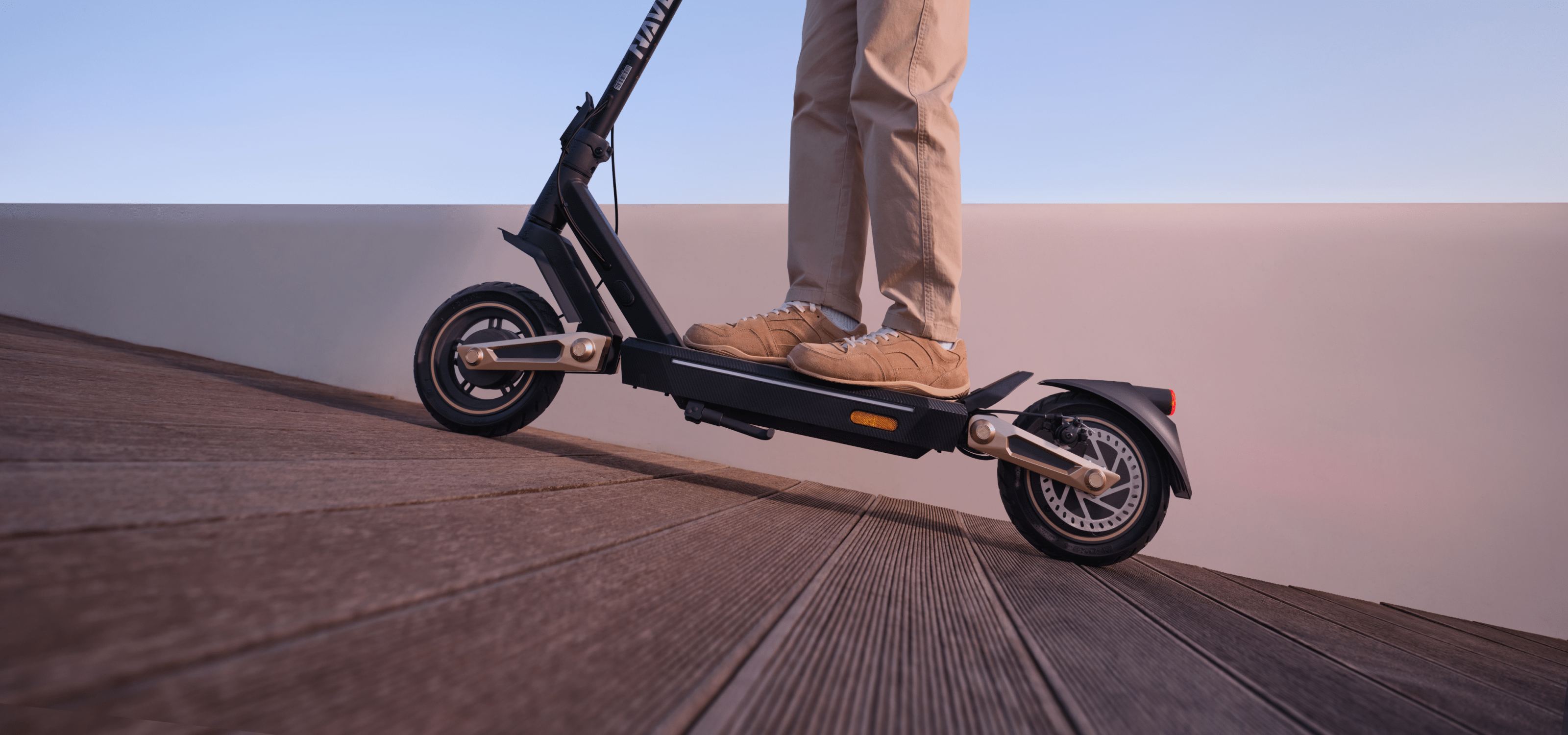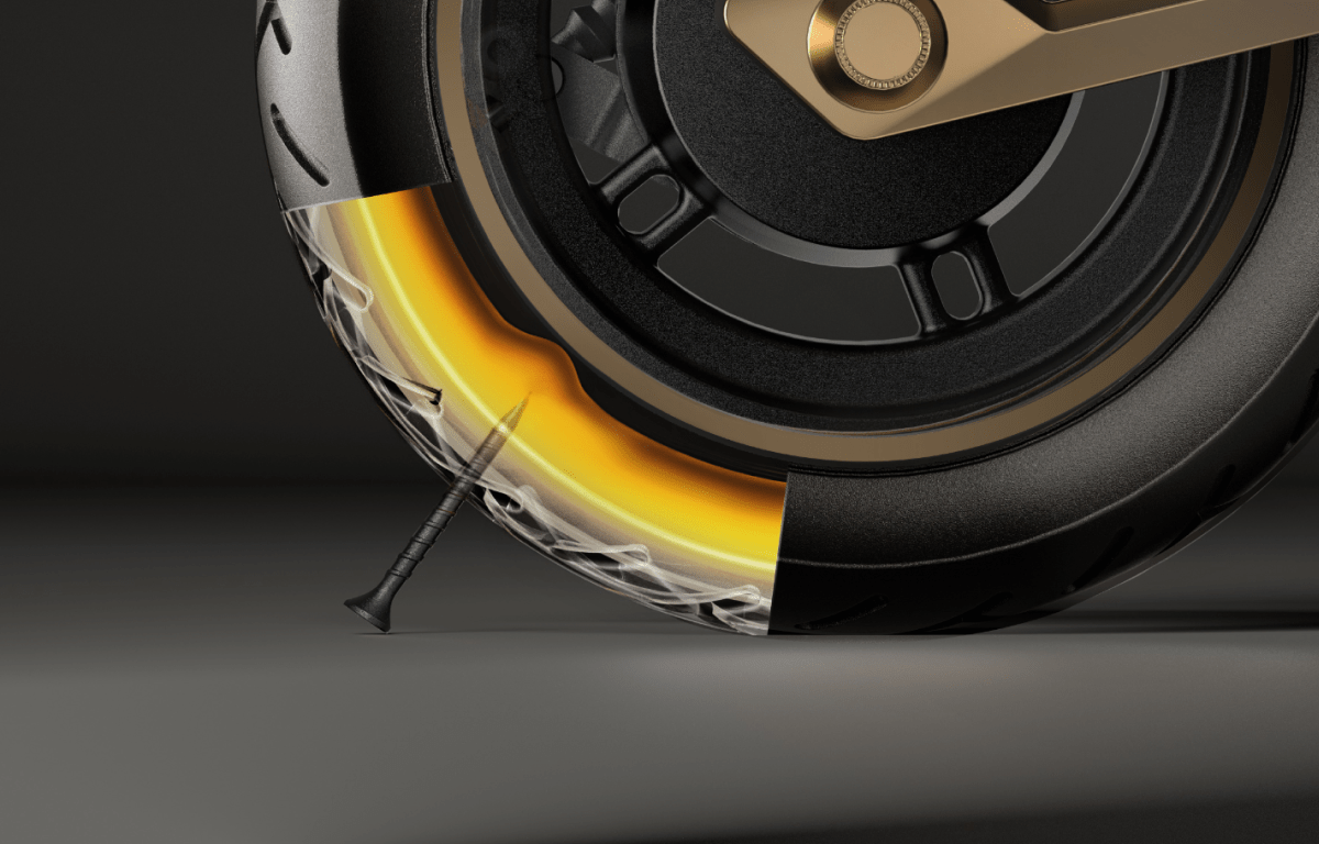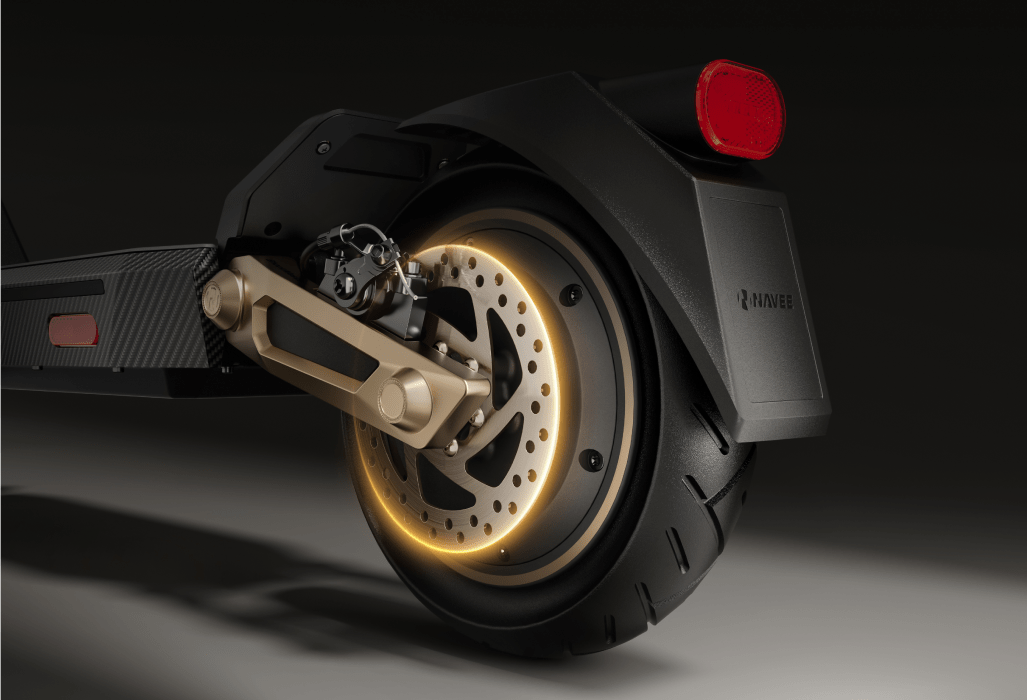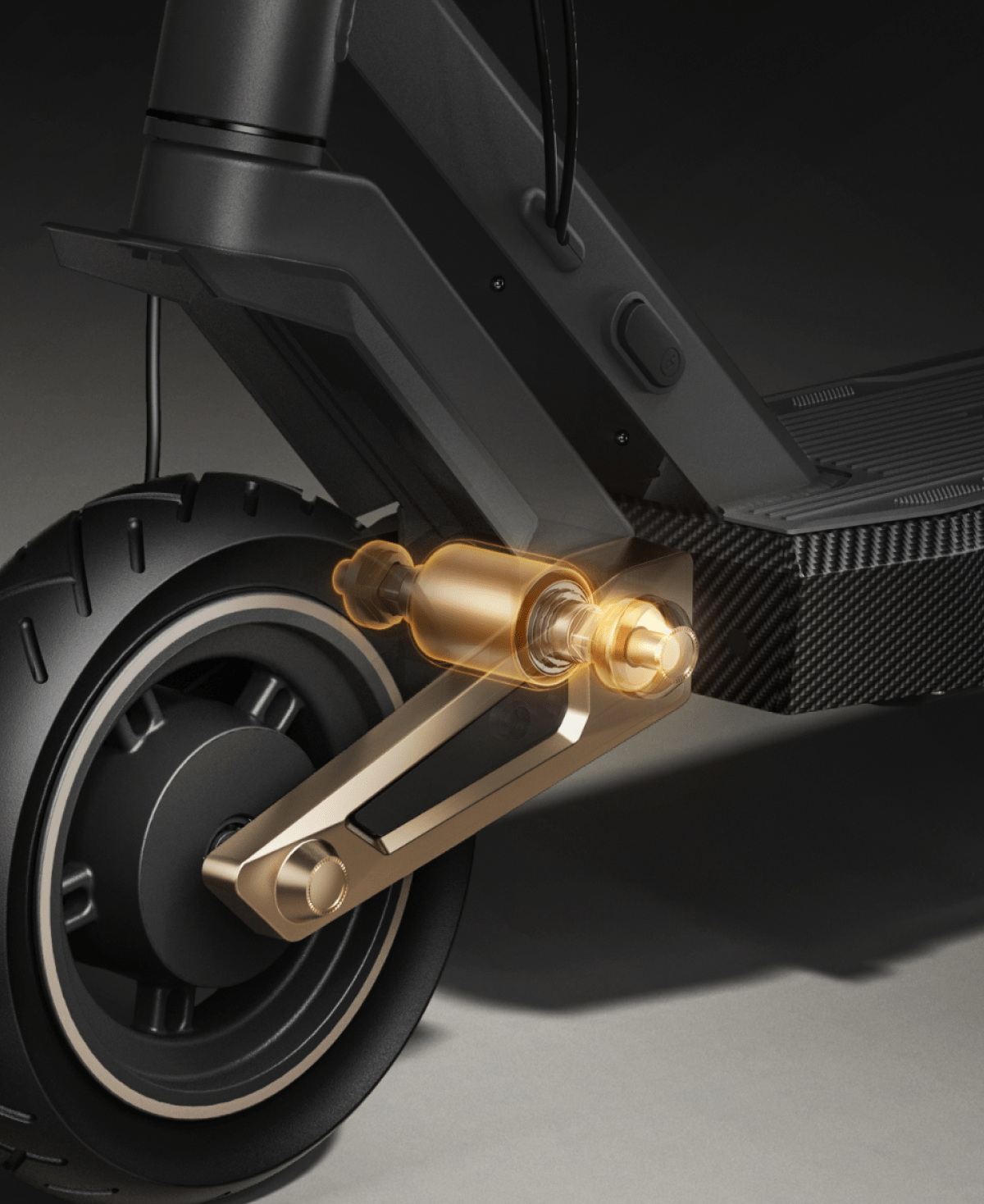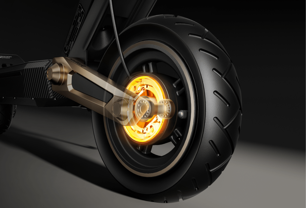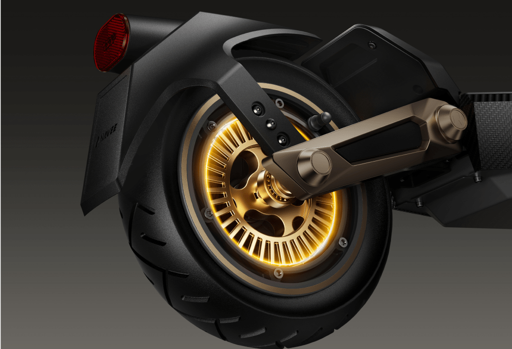 Un diseño audaz se combina con un rendimiento potente. Con cuatro brazos de amortiguación dorados para una absorción de impactos inigualable y una estética atractiva, este patinete eléctrico de alto rendimiento está diseñado para dominar cualquier terreno con confianza.