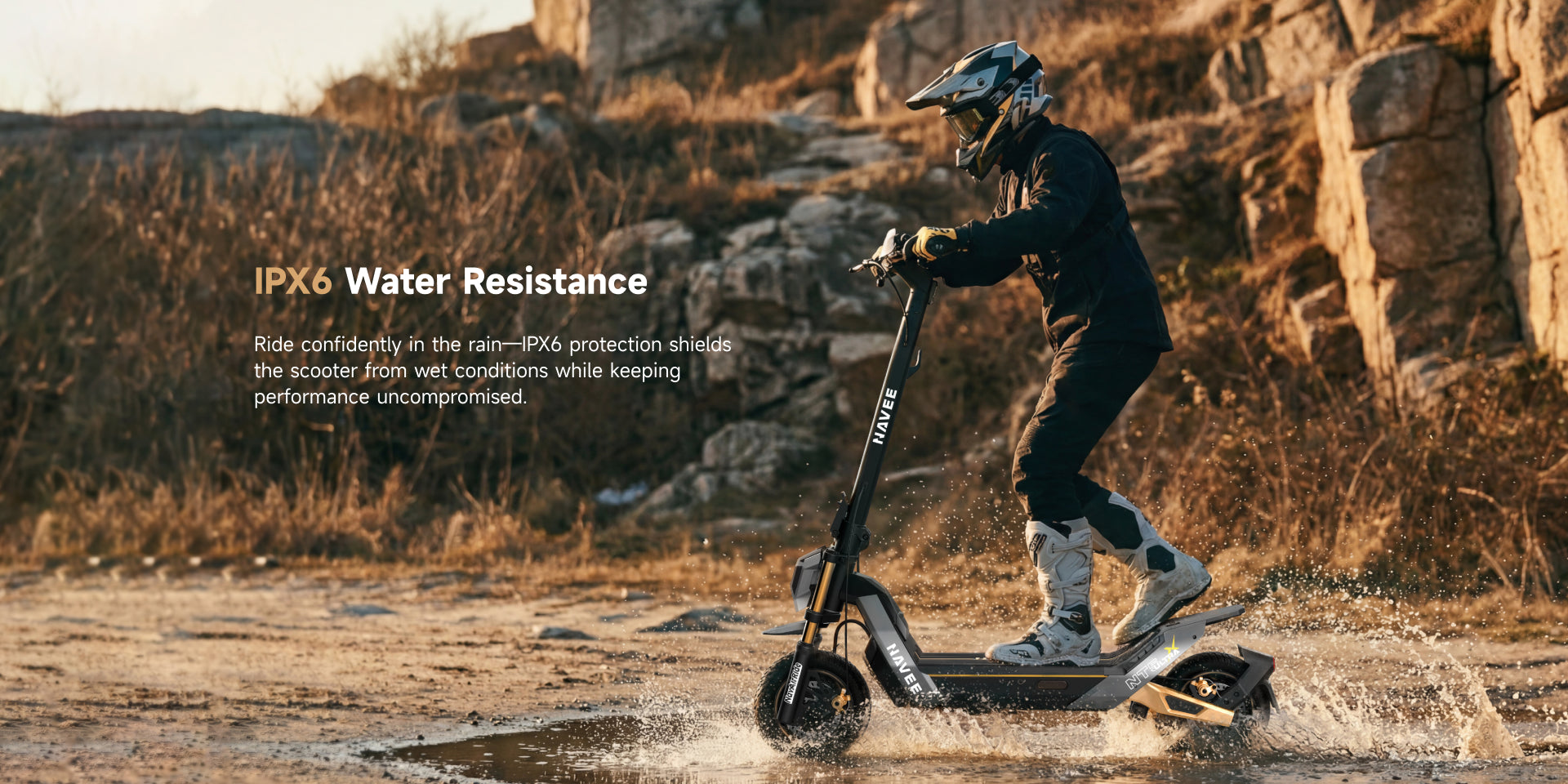 It has an IPX6 waterproof rating, meaning this offroad e-scooter can withstand heavy splashes and light rain—great for all-weather riding.